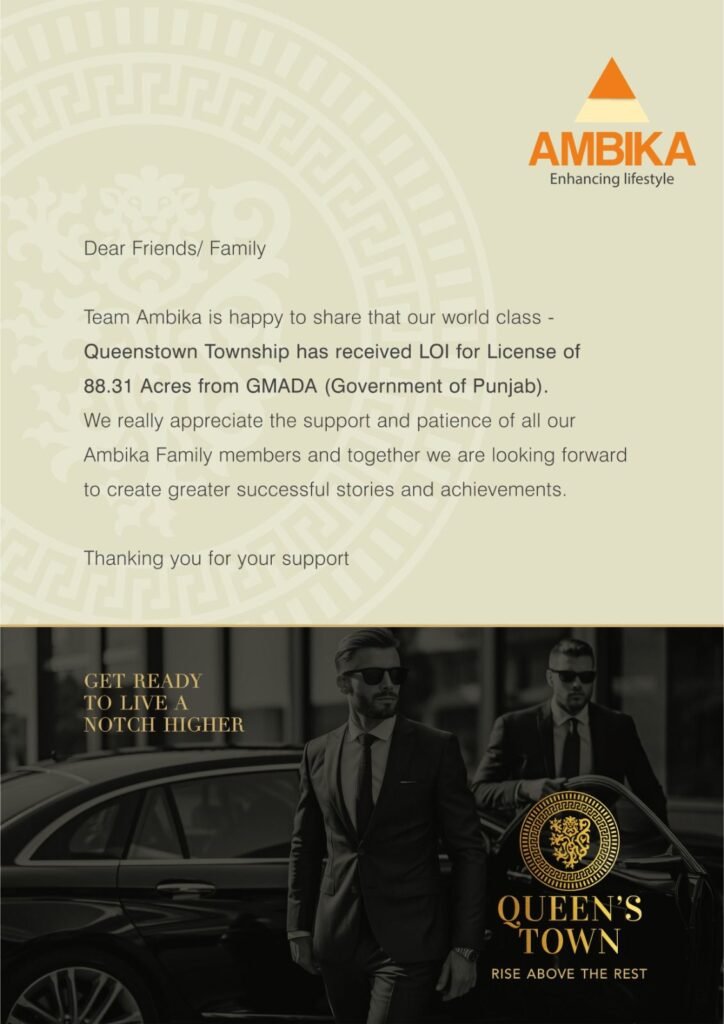 Dear investors, Team Ambika is thrilled to announce that our world-class project, Ambika Queenstown, has received a Letter of Intent (LOI) for a license of 88.31 acres from GMADA (Government of Punjab). This marks a significant step in establishing a township that promises exceptional living standards and amenities.